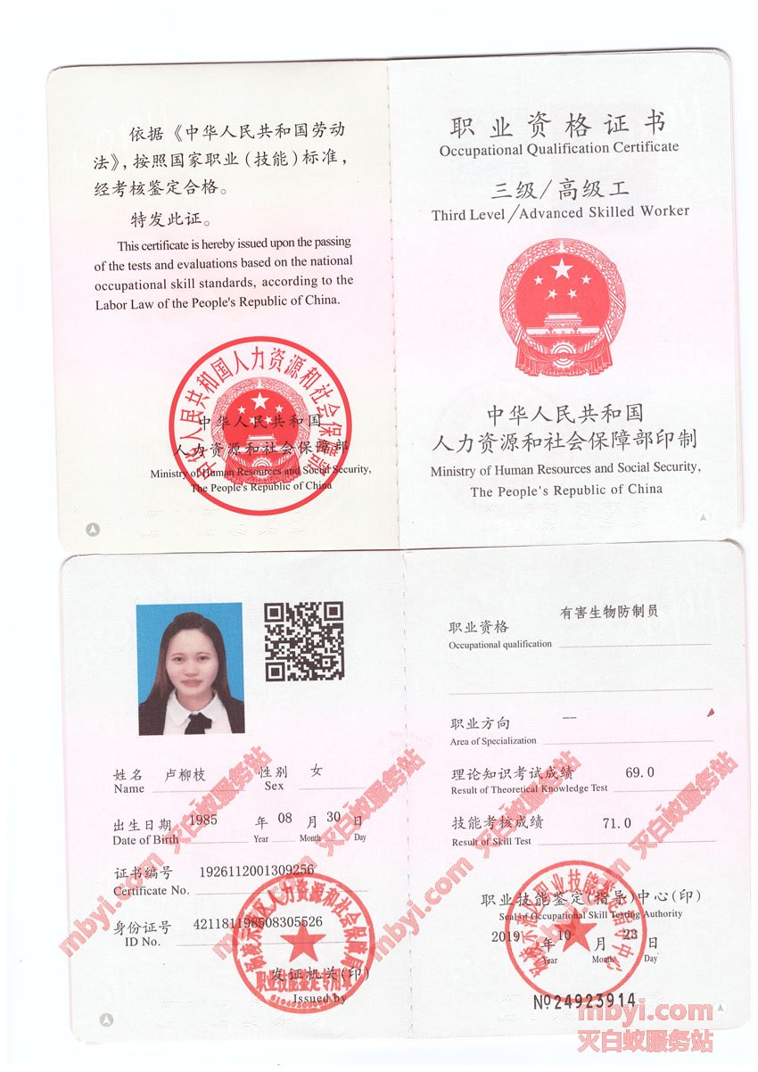 卢柳枝执业证书_卢师傅是白蚁虫害防治高级工程师