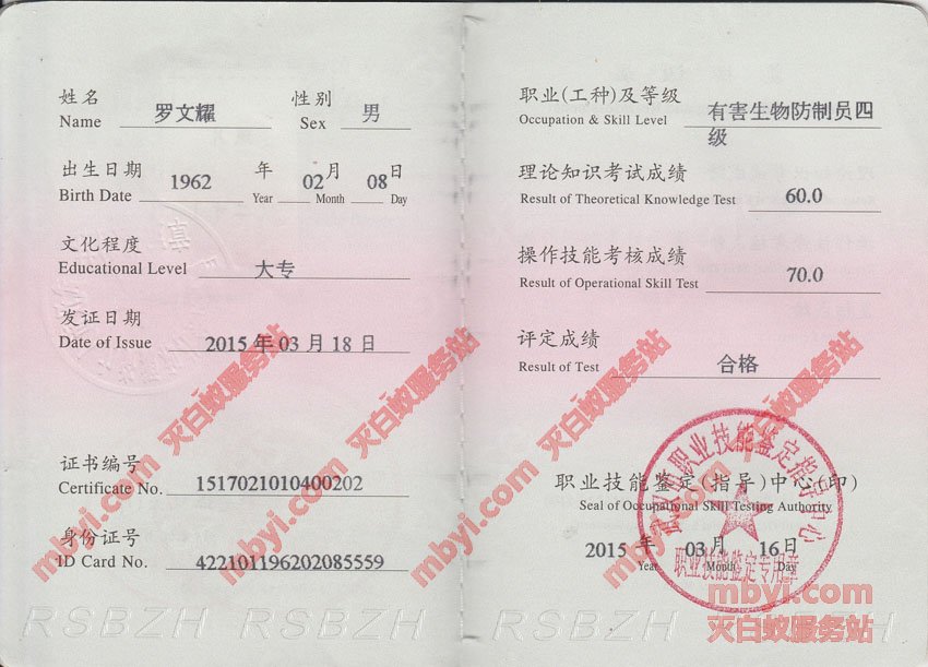 罗文耀执业证书_罗师傅是白蚁虫害防治中级工程师