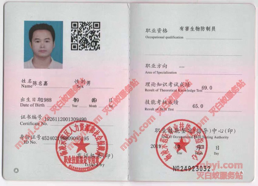 陈名嘉执业证书_陈师傅是白蚁虫害防治高级工程师